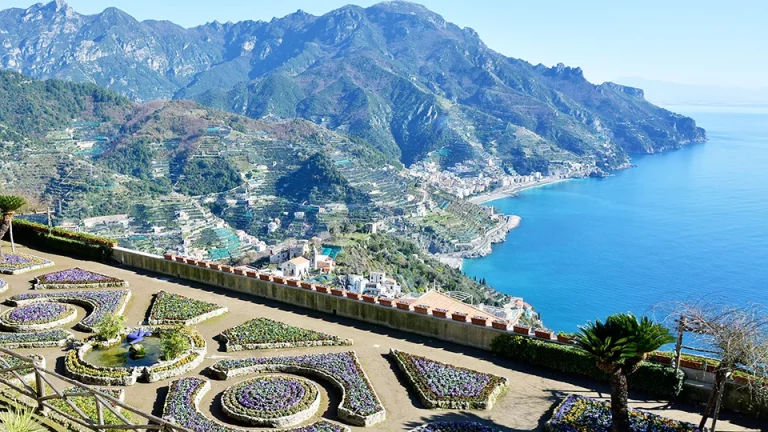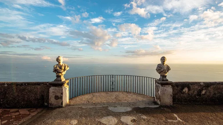 La città di Ravello non si trova direttamente sul mare ma visitandola ti imbatterai nelle sue splendide ville con terrazze panoramiche, che regalano viste mozzafiato dove il blu del cielo si confonde all’orizzonte con i colori dell’acqua cristallina del mare.