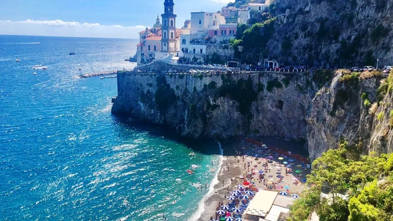 La prima cosa che si nota, una volta raggiunto l’arenile, è la bellezza dello scenario che si apre davanti agli occhi: da un lato siapprezza il campanile e la chiesa della Maddalena di Atrani e dall’altro il bell’aspetto dei nobili palazzi della frazione di Castiglione.